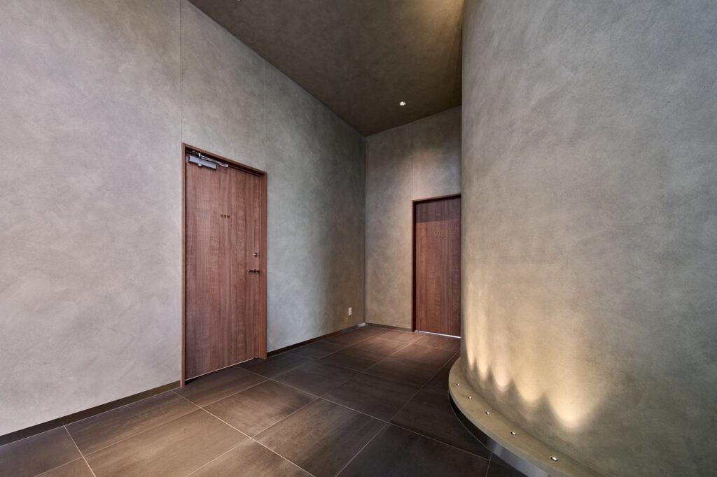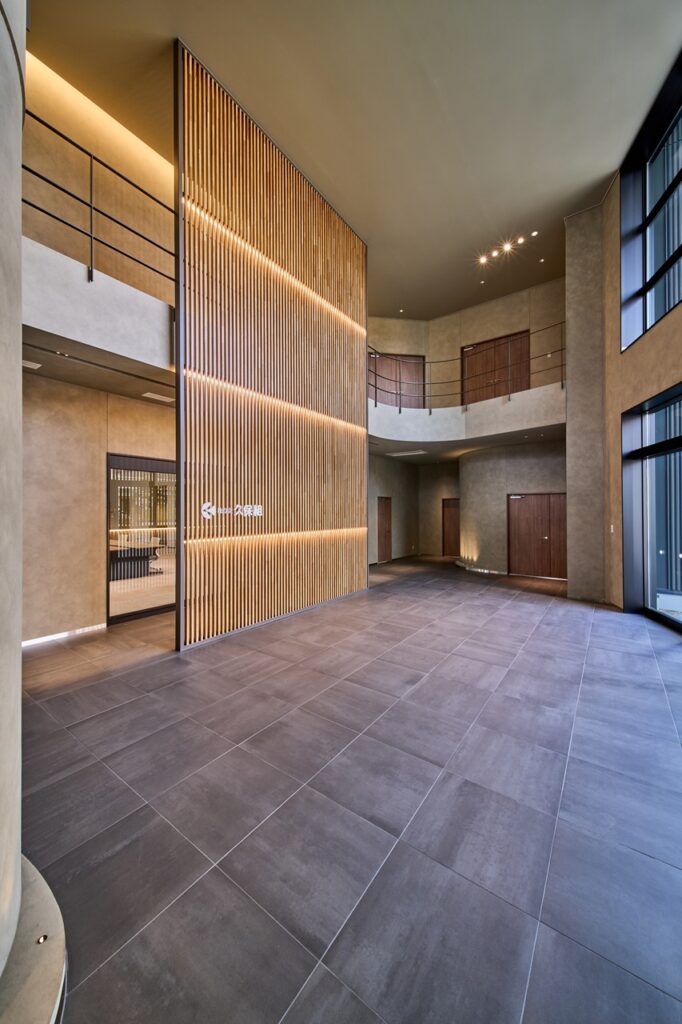 エントランスに入ると、開放的な吹き抜けには、ダイナミックに木製ルーバーが設置されており、ナチュラルな雰囲気が出迎えてくれます。ルーバーには間接照明が施され、主照明には眩しさを低減したダウンライトが選定されており、高級感とあたたかみを感じることのできる空間となっています。